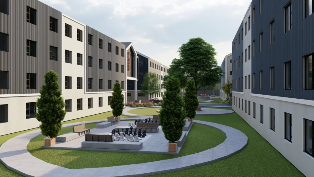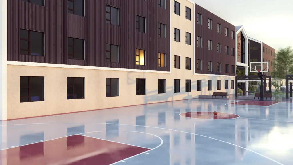 With a focus on creating a cohesive and uplifting environment, this project features various recreational areas, outdoor chess, basketball, and netball courts providing students with opportunities for physical activities and social interactions. A restaurant caters to the student’s dining needs and the commercial building offers valuable space for office use.